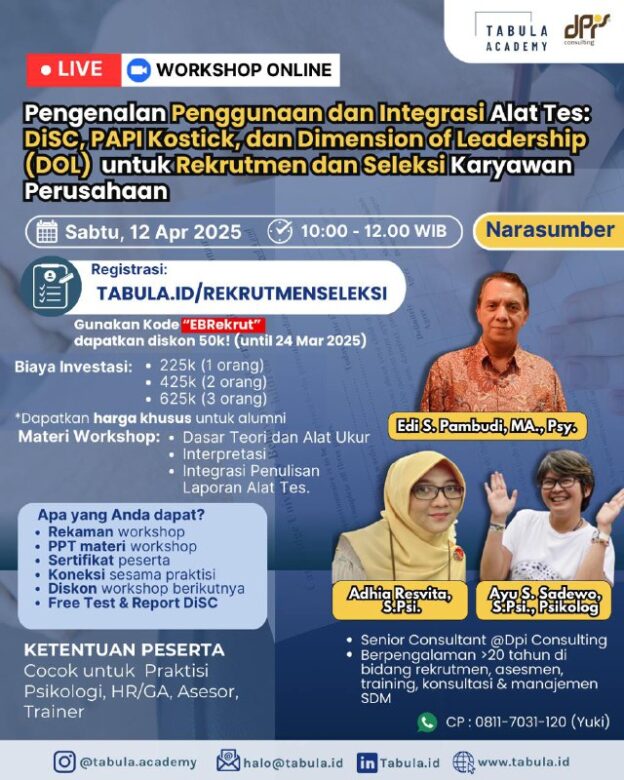 Course ini berisi rekaman webinar “Workshop Penggunaan dan Integrasi Alat Tes: DiSC, PAPI Kostick, dan Dimension of Leadership (DOL) untuk Rekrutmen dan Seleksi Karyawan Perusahaan”.